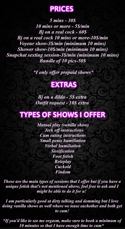 La mia specialità è il domming, ma adoro anche fare spettacoli vanilla, posso essere sensuale o dura a seconda di quanto riesci a gestire e cosa preferisci!